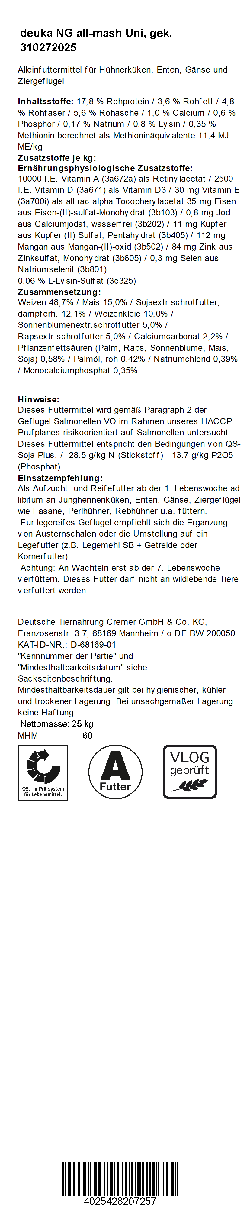 Weizen, Mais, Sojaextr.schrotfutter (dampferh.), Sonnenblumenextr.schrotfutter, Rapsextr.schrotfutter, Weizenkleie, Calciumcarbonat, Monocalciumphosphat, Natriumchlorid, Pflanzenfettsäuren (z. B. Raps, Sonnenblume, Kokos), Pflanzenöle