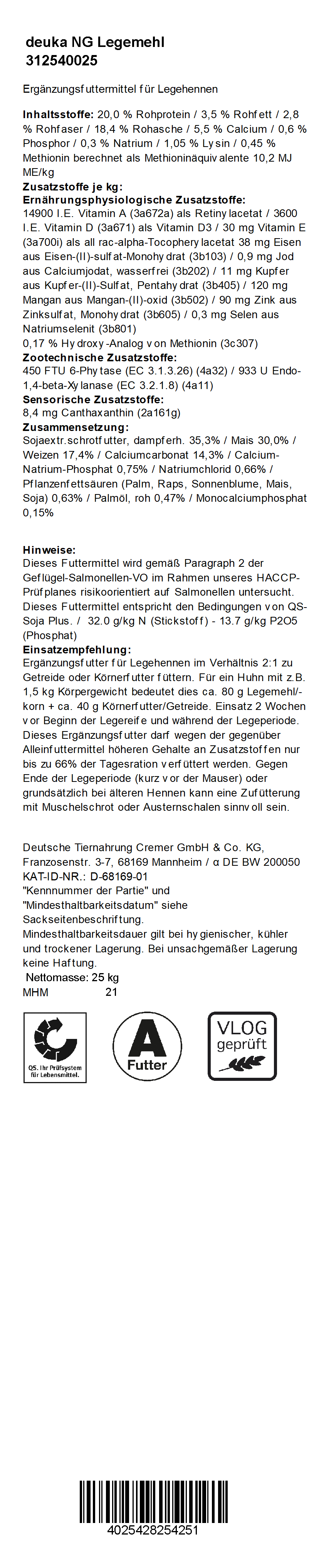 deuka NG Legemehl & deuka NG Legekorn sind Kombiprodukte zur Legehennenfütterung ab der Legereife. Die ausgewogene Rezeptur der Ergänzungsfutter sichert die Versorgung der Hennen und bildet so die Basis für Eier in höchster Qualität. Die hochwertige Protein-, Aminosäuren- und Calciumausstattung begünstigt eine starke Eischalenbildung. Zugesetzte Vitamine, Spurenelemente und Mineralien helfen die Versorgung des Geflügels zu sichern und ermöglichen so eine artgerechte Legetätigkeit.