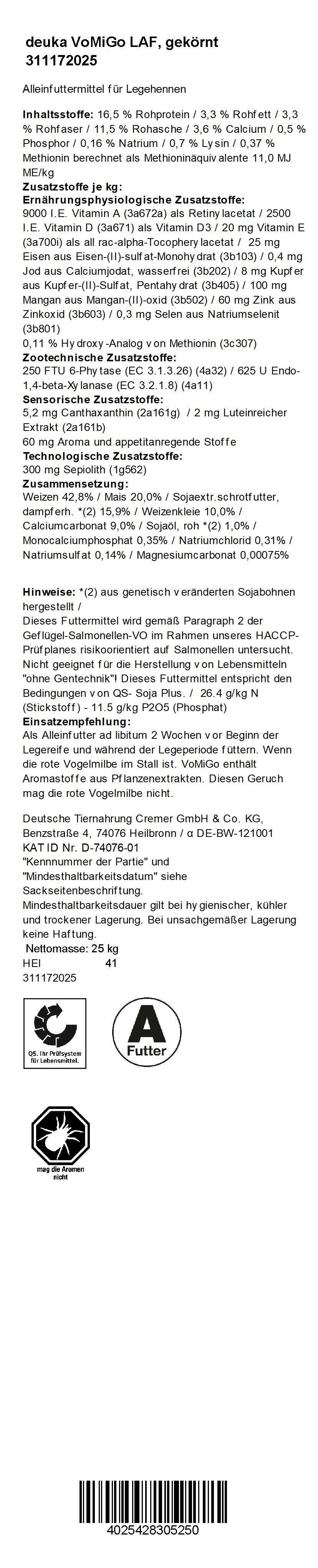 deuka VoMiGo LAF ist ein besonderes Alleinfutter für Legehennen ab der Legereife. Mit seinen pflanzlichen Aromastoffen eignet sich das Geflügelfutter optimal zur Fütterung vor oder während eines Befalls mit der Roten Vogelmilbe (Dermanyssus gallinae). Die natürlichen Duftstoffe haben aber keinen Einfluss auf den Geschmack oder Geruch der Hühnereier. Der Befall mit dem blutsaugenden Ektoparasiten bedeutet Stress für die Herde und zugleich ein echtes Gesundheitsrisiko für das Geflügel.
