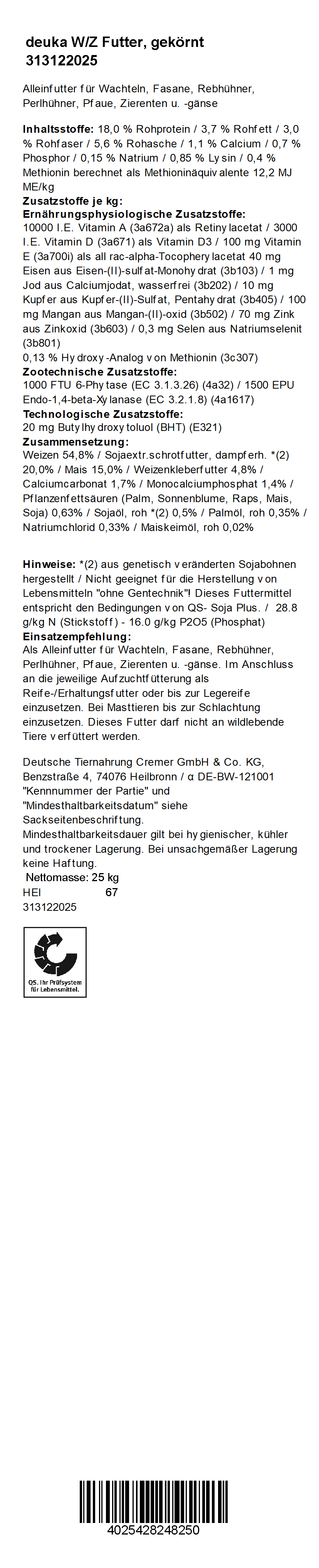 deuka Wachtel und Ziergeflügel (W/Z) Futter ist ein Alleinfutter zur Rundumversorgung ausgewachsener Wachteln, Fasanen, Rebhühnern, Perlhühnern, Pfauen, Ziergänsen, Zierenten und anderem Ziergeflügel. Es eignet sich zur Reife- und Erhaltungsfütterung im Anschluss an die Kükenphase bis zur Legereife sowie bei Masttieren bis zur Schlachtung. Wachteln erhalten deuka W/Z Futter ab der 4. Woche, Fasane, Rebhühner, Perlhühner, Pfauen sowie Ziergänse und -enten ab der 7. Lebenswoche.