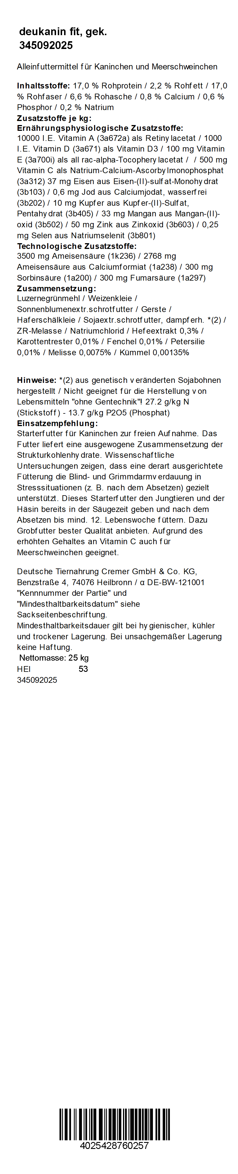 Luzernegrünmehl, Haferschälkleie, Weizengrießkleie, Sonnenblumenextr.schrotfutter, Gerste, Zuckerrübenmelasse, Sojaextr.schrotfutter (dampferh.), Natriumchlorid, Hefeextrakt, Fenchel, Petersilie, Pfefferminze, Melisse, Thymian, Kümmel