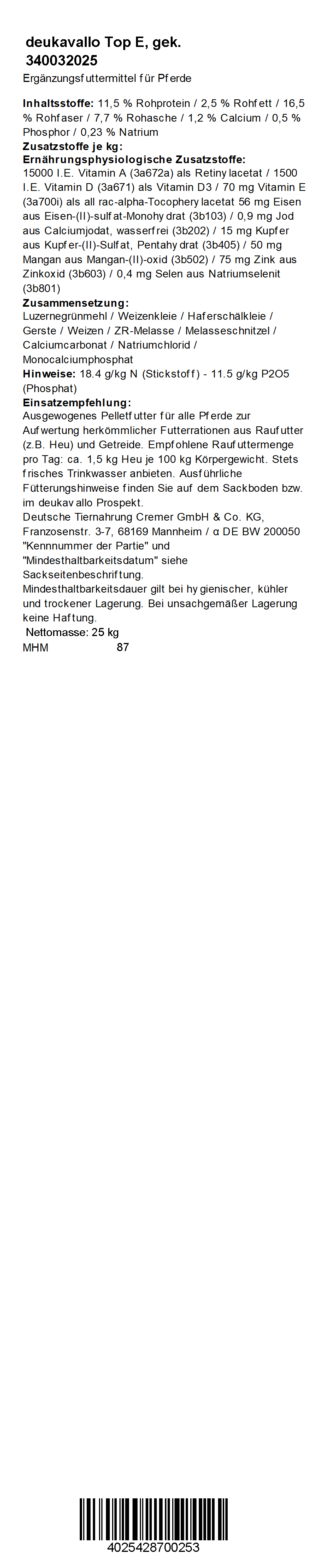 Kenne Deukavallo Futter bereits seit Jahrzehnten. Ob in einer Reitschule oder in privaten Ställen habe ich in Erinnerung, dass Deukavallo Top E mit Hafer gefüttert wurde. Seit Jahren füttere ich Deukavallo Top E meinem eigenen Pferd gemischt mit Hafer. Ab und zu greife ich je nachdem auf das Getreidefrei oder ein Müsli zurück von Deukavallo als zusätzliche Ergänzung bei hohen Anforderungen. Aber als Grundkraftfutter ist das Deukavallo Top E mit gesundem Hafer jeweils in angepasster Mengen ein günstiges, einfaches und sauberes Futter. Einmal bin ich versuchsweise auf anderes Futter umgestiegen, was letztendlich eine Allergie bei meinem Pferd ausgelöst hat, Verdauungsprobleme und Probleme beim Stoffwechsel. Ganz zügig bekam mein Pferd wieder sein gewohntes Top E und es ging im nach einiger Zeit wieder sehr gut. Meiner Erfahrung nach benötigen Pferde gar nicht so viel an Inhaltsstoffen und Zusatzstoffen und mit dem Top E kann man nichts falsch machen. Ich verwende es ab und an als Mash gemischt mit Kräutern, Schwarzkümmelsamen oder Leinsamen bei Bedarf. Die Pellets quellen kaum auf und das Futter riecht aufgeweicht sehr frisch. Ich bin von der Qualität seit Jahren überzeugt. Auch bei jungen Pferden sehr sinnvoll in Kombination mit Hafer, die im Wachstum sind. Die Internetseite finde ich übrigens sehr übersichtlich und klein gehalten. Gut finde ich auch dass Deukavallo auch neue Zusatzfutter anbieten, die man bei Bedarf bequem und einfach bestellen kann.