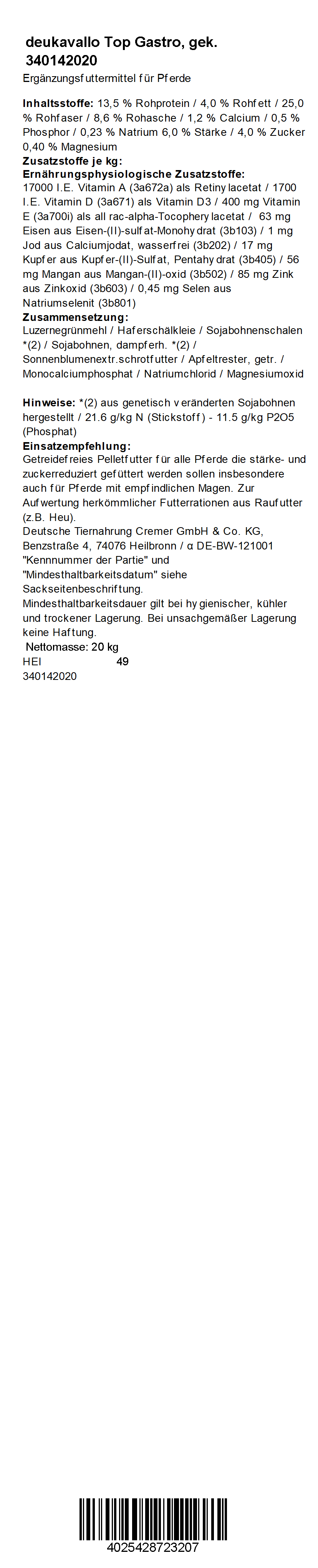 deukavallo Top Gastro ist ein pelletiertes Krippenfutter, das speziell für stoffwechselempfindliche Pferde entwickelt wurde. Es besitzt eine stärke- (ca. 6 %) und zuckerreduzierte (ca. 4 %) Rezeptur ohne Getreide und Melasse. Gleichzeitig sichert es bereits bei kleinen Futtermengen die bedarfsgerechte Vitamin- und Mineralversorgung des Pferdes. Das Futter ist für alle Pferderassen und Altersklassen geeignet.
