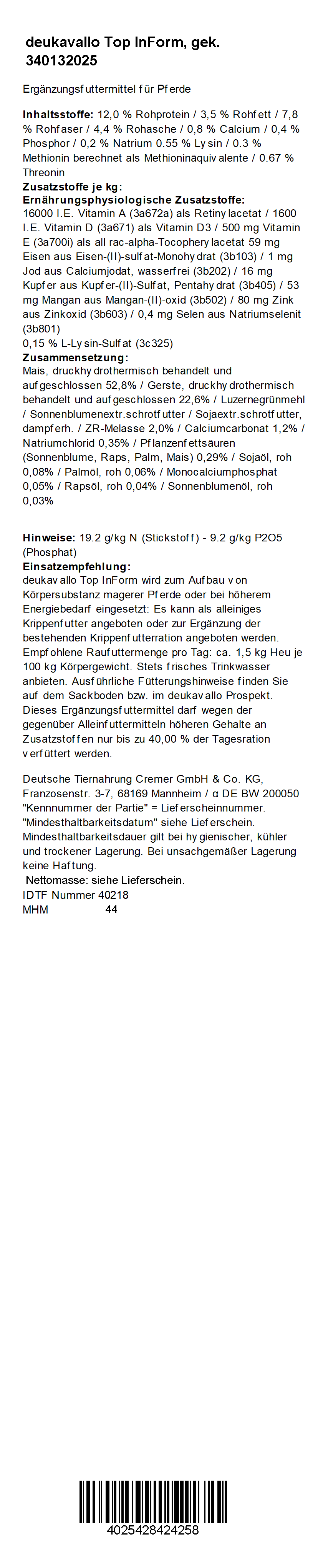 Das Kraftfutter deukavallo Top InForm bietet hoch verfügbare Energie durch bestmöglich aufgeschlossene Stärke. Diese wird im Dünndarm der Pferde nahezu vollständig verdaut. Das verhindert Verdauungsentgleisungen und eine besonders effektive Fütterung. Damit eignet sich das Spezialfutter zur Versorgung von Sportpferden während der Turniersaison, die ihren hohen Energiebedarf mit einer Ration aus Rau- und Basiskrippenfutter allein meist nicht decken können.